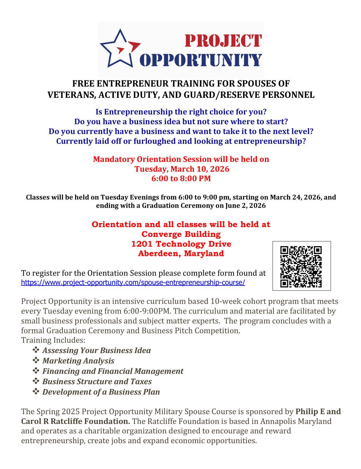 Project Opportunity is an intensive curriculum based 10-week cohort program that meets every Tuesday evening from 6:00-9:00PM. The curriculum and material are facilitated by small business professionals and subject matter experts. The program concludes with a formal Graduation Ceremony and Business Pitch Competition. Training Includes:  Assessing Your Business Idea  Marketing Analysis  Financing and Financial Management  Business Structure and Taxes  Development of a Business Plan